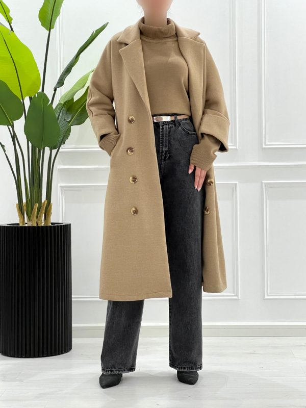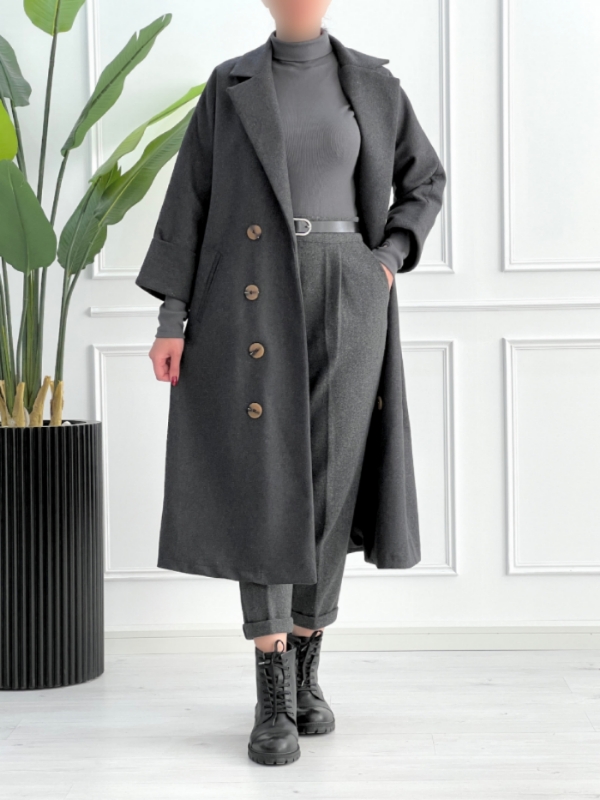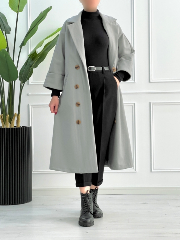 این پالتو دارای ۸ دکمه جلویی تزیینی است که به لباس جلوهای متفاوت میبخشد و دو جیب مورب دارد که علاوه بر زیبایی، بسیار کاربردی است و برای نگهداری وسایل روزانه شما مناسب است. در قسمت پشت پالتو نیز دو پاگن با دکمههای جذاب طراحی شده که به ظرافت و زیبایی لباس اضافه میکند.