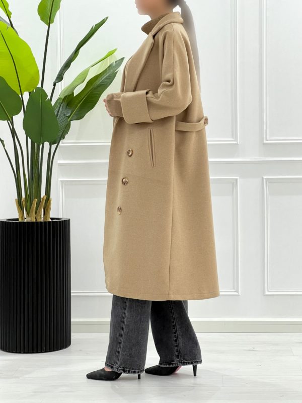 یکی از ویژگیهای جذاب این پالتو، طراحی یقه انگلیسی آن است که به لباس جلوهای شیک و کلاسیک میبخشد. مچ پاکتی آستینها نیز علاوه بر زیبایی، کاربردی بوده و باز نمیشود، که این امر باعث میشود در روزهای سرد به راحتی آن را بپوشید.