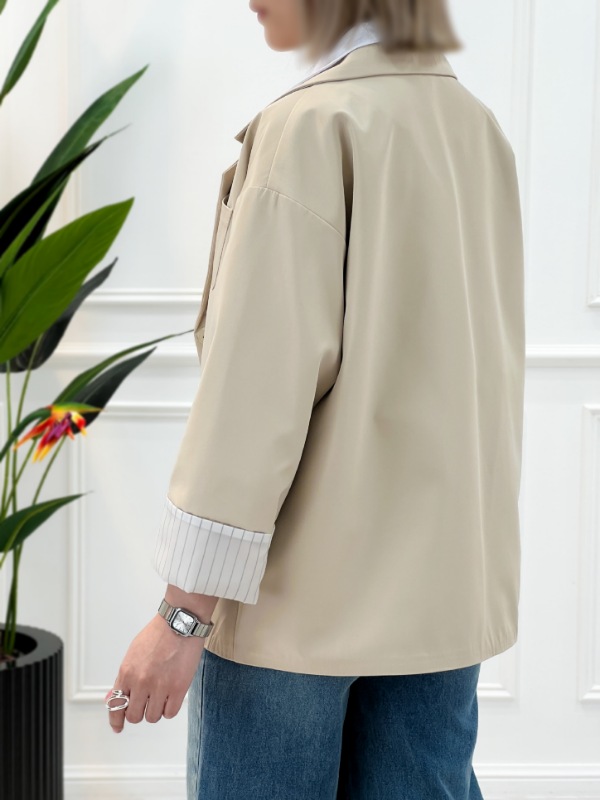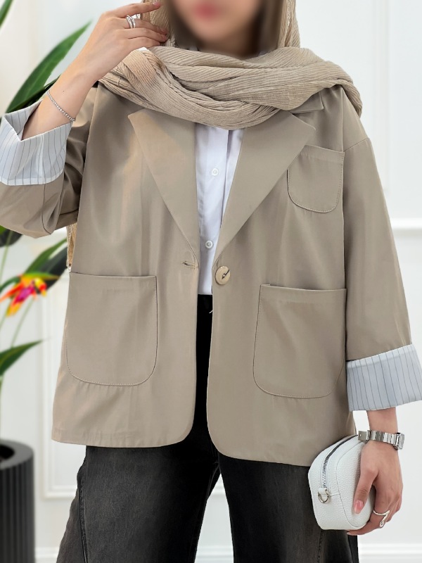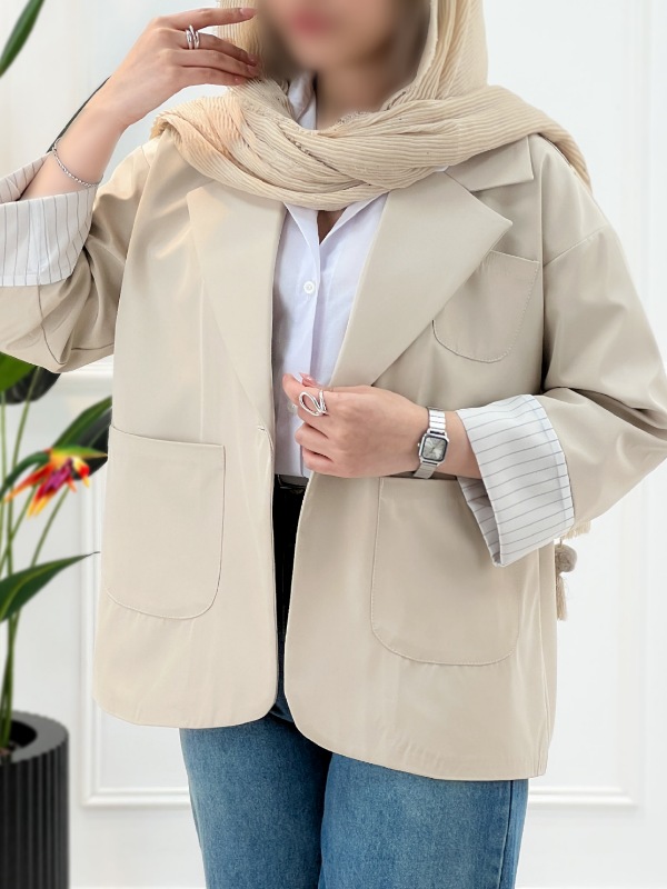 این مدل دارای یقه انگلیسی کلاسیک است که به آن جلوهای شیک و رسمی میبخشد. جلوی بارانی تنها یک دکمه دارد که بهراحتی باز و بسته میشود. همچنین مچ آستینها به صورت پاکتی طراحی شده و بازشو هستند، که علاوهبر زیبایی، راحتی بیشتری در پوشیدن ایجاد میکنند.