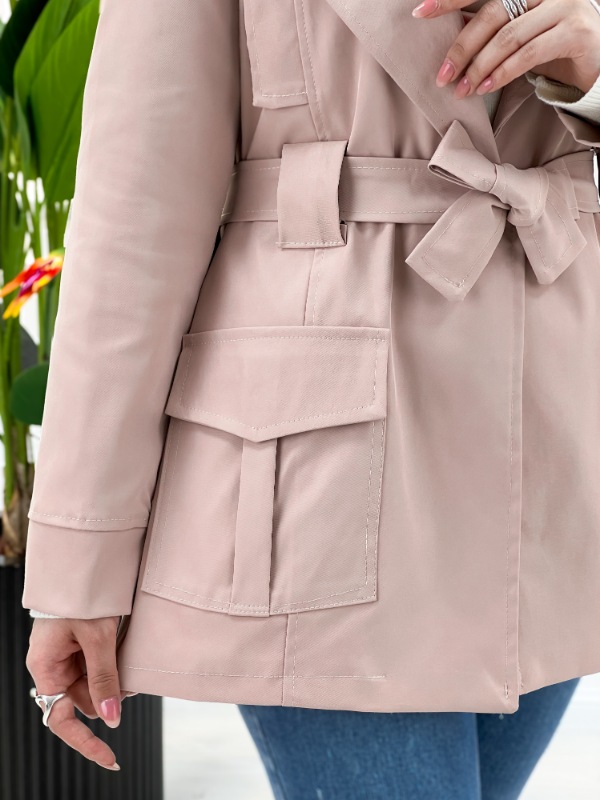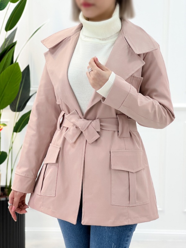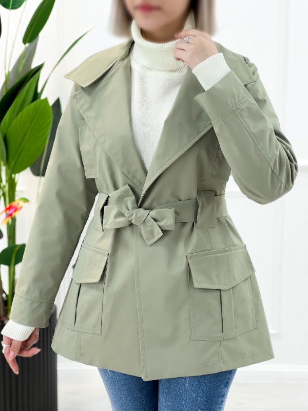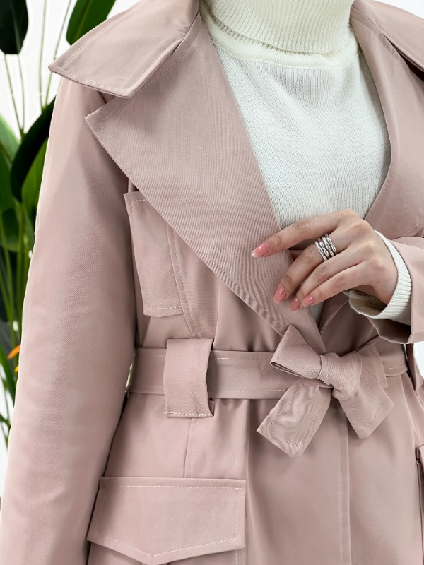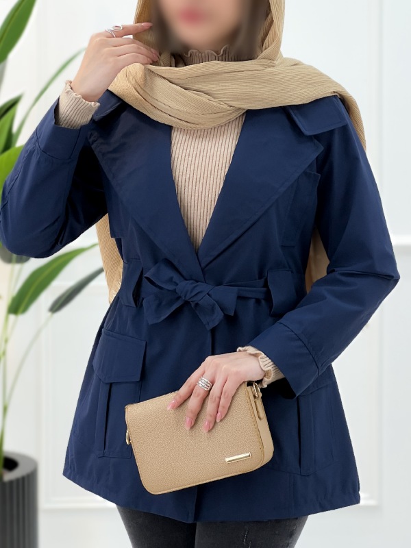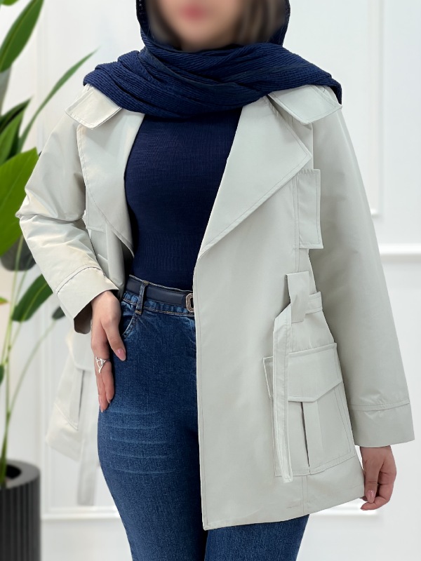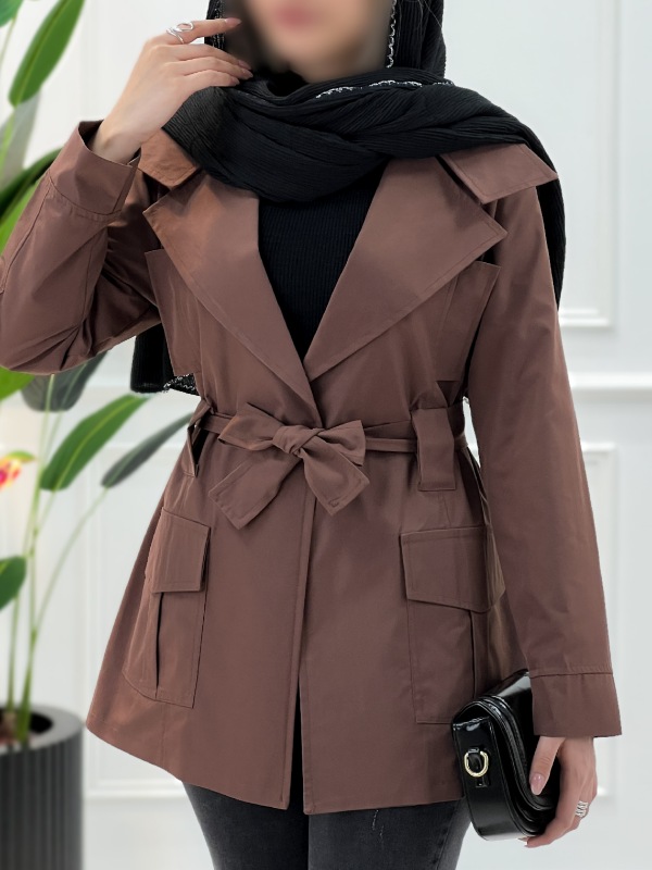 بارانی دخترانه هلنا با طراحی یقه انگلیسی، کمربند سگک‌دار، جیب مورب و جنس باکیفیت تی‌سی، مناسب برای استفاده روزمره و استایل پاییزی