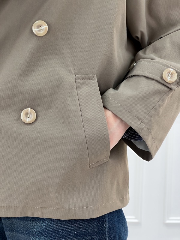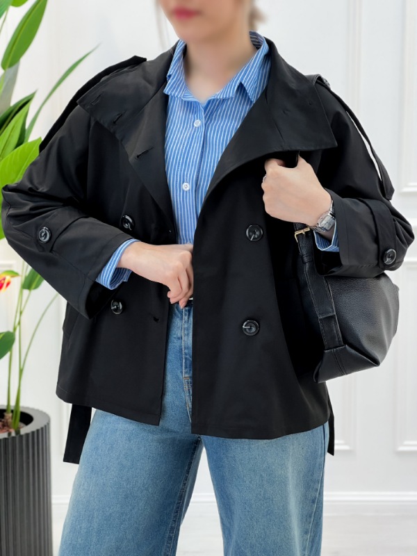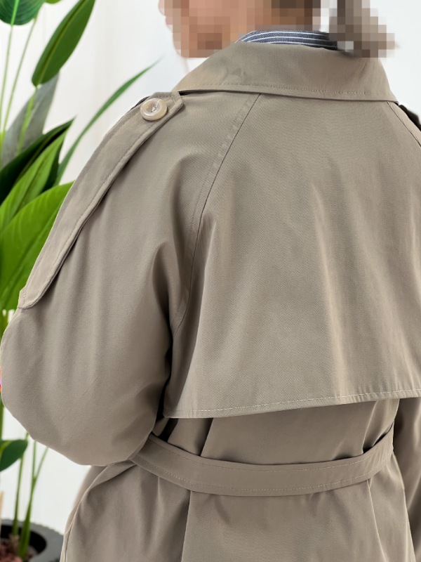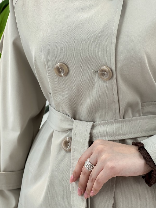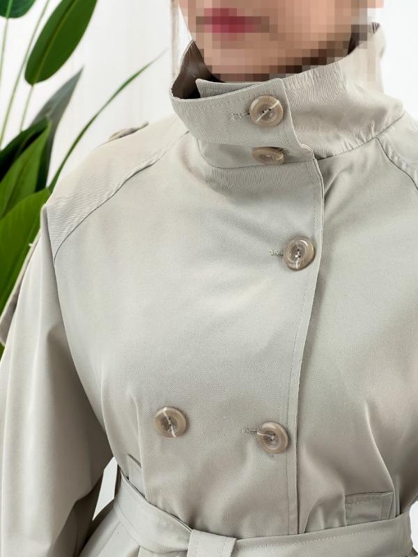 یقه ایستاده، دکمه‌های جلوی کت، دو جیب مورب و کاربردی، و همچنین وجود کمربند جداگانه از جنس خود کت، همگی به کاربردی بودن این مدل افزوده‌اند. سرشانه و مچ آستین با طراحی پاگن و دکمه‌ی تزئینی، حالتی خاص و متفاوت به لباس داده‌اند. همچنین پشت لباس دارای ژیله است که جلوه‌ای خاص به ترنچ کت می‌بخشد.