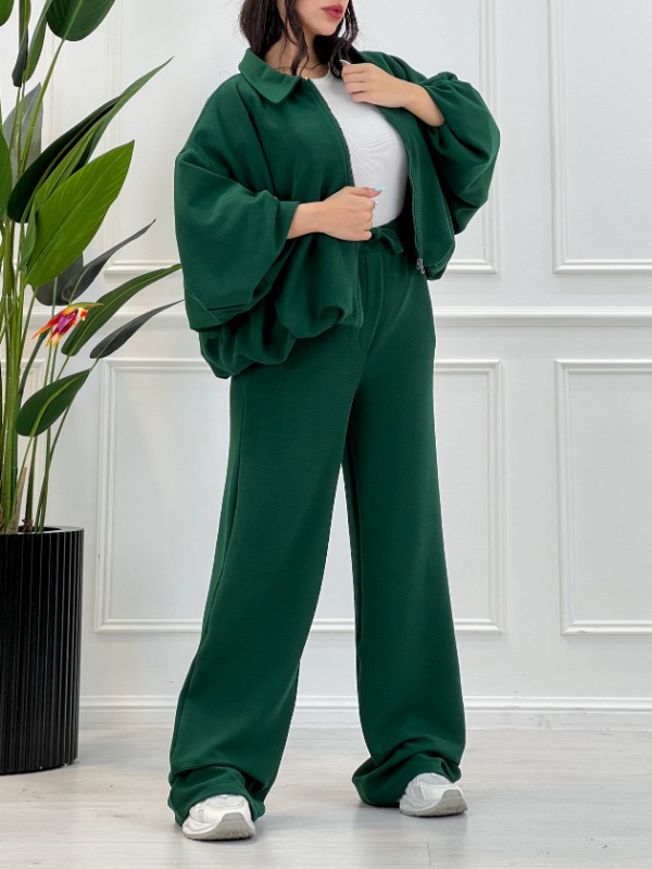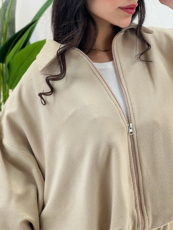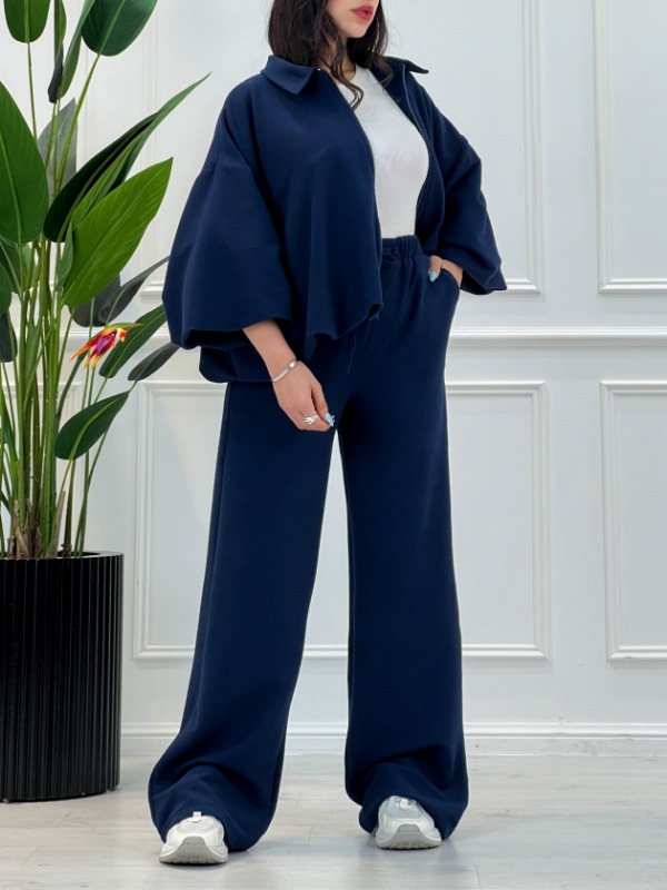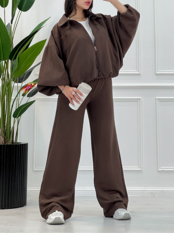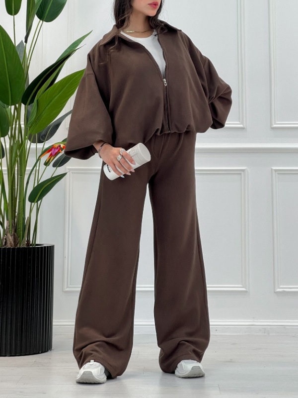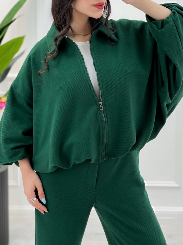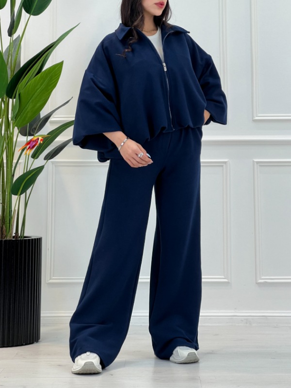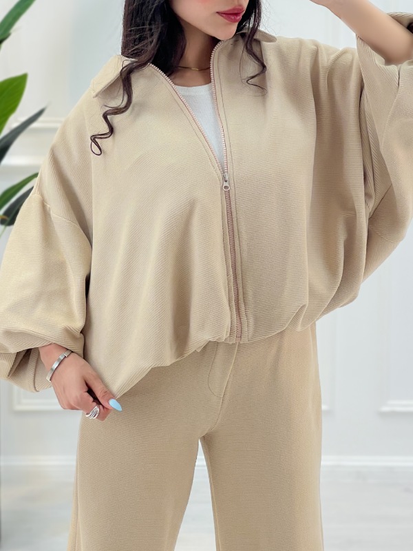 سویشرت این ست با یقه مردانه و مدل کیمونو، ظاهری خاص و امروزی دارد. قسمت جلوی سویشرت با زیپ باز و بسته میشود و پایین آن حالت پلیسهای دارد که جذابیت بیشتری به طراحی میبخشد. همچنین آستر داخلی سویشرت باعث افزایش گرما و راحتی در روزهای سرد میشود.