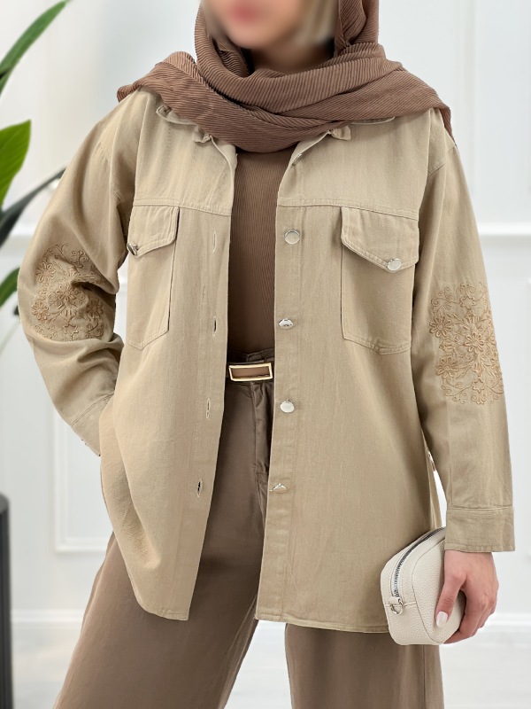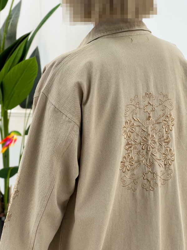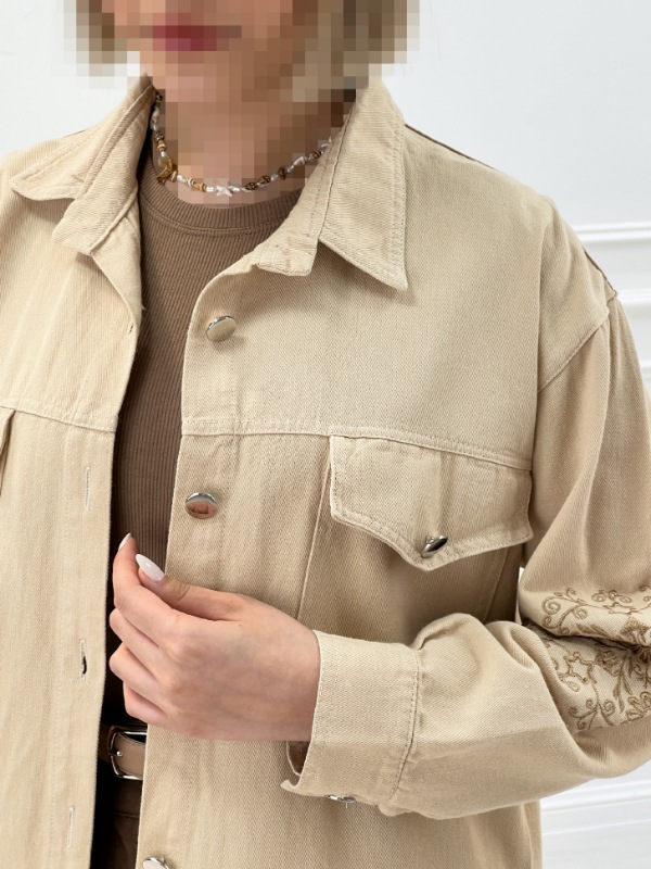 عکس یک مانتو گیپور زنانه با یقه مخمل آرشال، طراحی گل‌های برجسته و مرواریددوزی ظریف، مناسب برای استایل‌های رسمی و روزمره