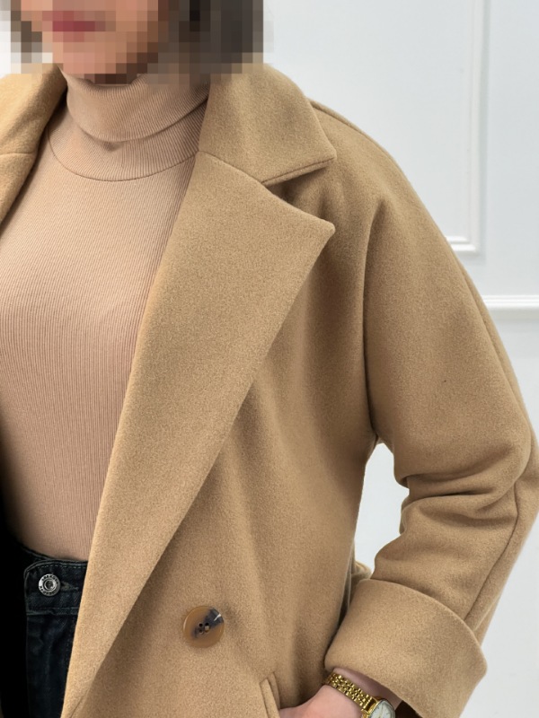 یکی از ویژگیهای جذاب این پالتو، طراحی یقه انگلیسی آن است که به لباس جلوهای شیک و کلاسیک میبخشد. مچ پاکتی آستینها نیز علاوه بر زیبایی، کاربردی بوده و باز نمیشود، که این امر باعث میشود در روزهای سرد به راحتی آن را بپوشید.