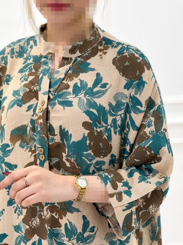 مدل یقه ایستاده این پیراهن، جلوهای خاص و کلاسیک به آن داده و دکمههای جلوی لباس، علاوه بر زیبایی، کارایی بالایی نیز دارند. مچ آستینها به صورت پاکتی طراحی شدهاند و دارای پاگن هستند که حس خاصتری به استایل شما میدهند. سرشانه افتاده نیز از دیگر ویژگیهایی است که باعث میشود لباس تنخور آزاد و شیکی داشته باشد.