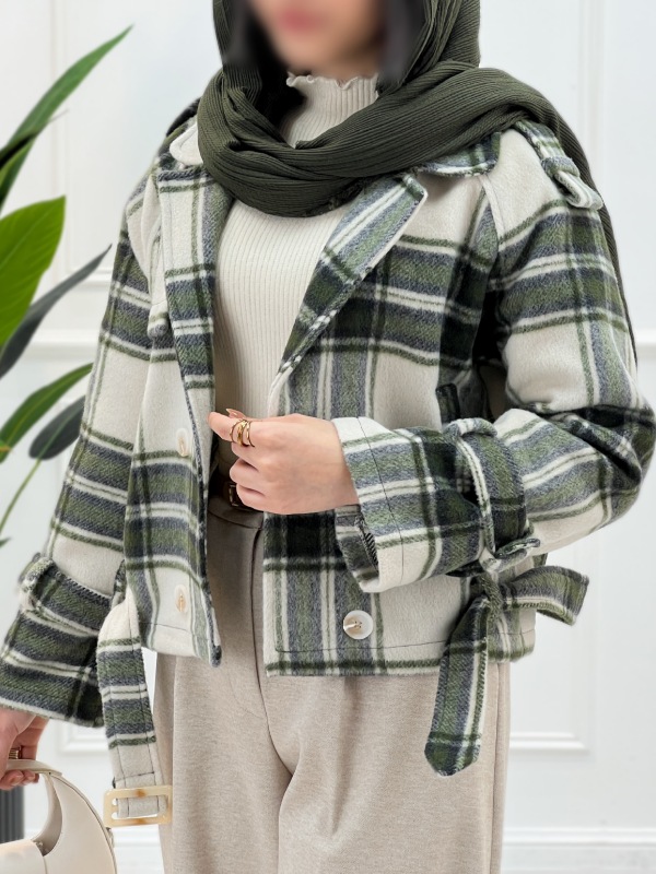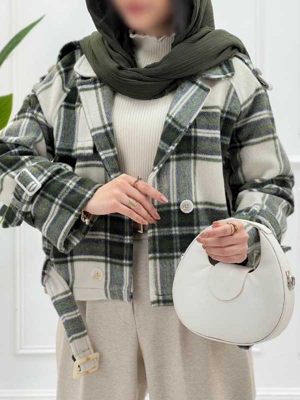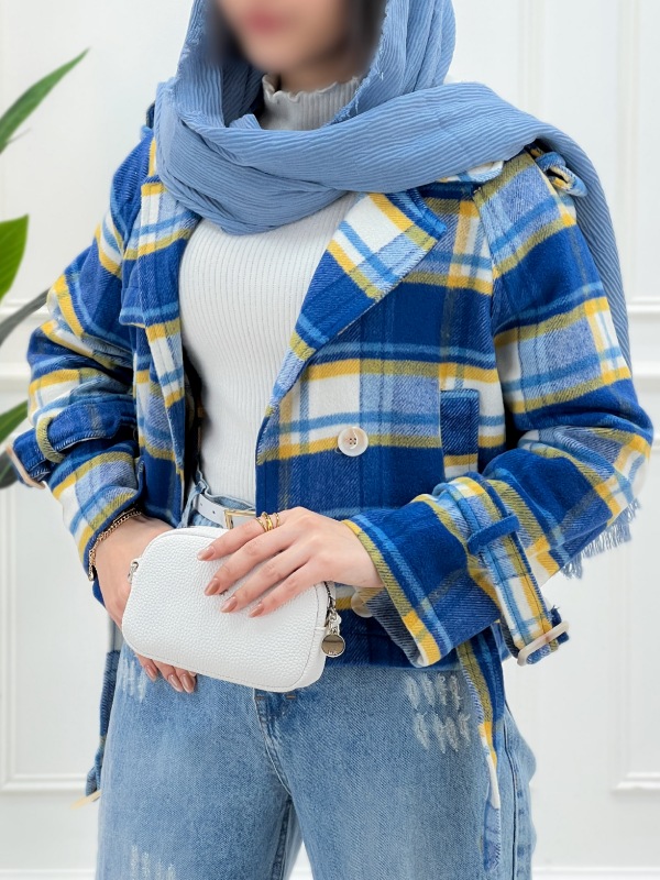 کت تک دکمه چهارخونه زنانه با پارچه پشمی باکیفیت، یقه انگلیسی، آستین پاکتی و دو جیب کاربردی، مناسب فصل پاییز و زمستان.