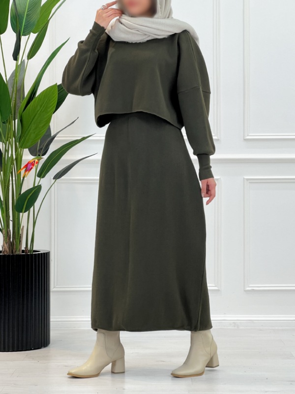 این لباس از **بافت درجهیک و گرم** تهیه شده که بسیار لطیف، بادوام و مناسب فصل پاییز و زمستان است. **کراپ با مدل یقه گرد و سرشانه افتاده** طراحی شده که ظاهری اسپرت و مدرن دارد. دور یقه و مچ آستین کراپ بهصورت **راهراه** است که به جذابیت آن افزوده و حالت اسپرت و متفاوتی به آن داده است.